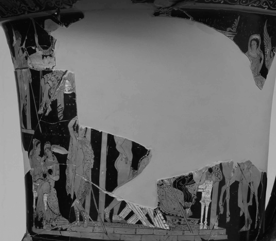 Le premier exemple que nous examinerons est celui d’un cratère apulien, provenant de Ceglie del Campo, conservé à Boston, et daté de 350-340 av. J.C.30. La décoration est très élaborée, au point de comprendre quatorze personnages, tous identifiés par une inscription, et distribués en trois lignes horizontales autour d’un édicule. Pour ce qui nous concerne, la partie centrale est particulièrement digne d’attention. Dans l’édicule, en effet, on voit Phœnix, qui se tient debout et s’appuie sur son bâton en tenant son visage dans la main, en signe de désespoir. Près de lui, Achille, assis sur une kline aux coussins richement ornés, tient une lance à la main droite. Il est aussi armé d’une épée, dont on voit seulement la poignée, à son côté gauche. Au-dessous de l’édicule, on voit le corps décapité de Thersite, partiellement couvert d’un manteau : la barbe sur son visage et le bâton qui se trouve près de lui indiquent qu’il s’agit d’un vieillard, mais sa figure ne montre pas les défauts physiques décrits dans l’Iliade. Enfin, les derniers personnages sur lesquels nous nous arrêterons sont ceux qui se trouvent à droite du pavillon. Il s’agit de Diomède, qui avance vers Achille de façon menaçante, la main sur l’épée. Il est retenu par Ménélas, qui le prend par les épaules. Les deux sont suivis par un jeune homme, désigné génériquement comme « étolien » (ΑΙΤΩΛΟΣ). Armé d’une épée et d’un bouclier, celui-ci tient deux javelots à la main droite : il n’est pas facile d’établir s’il veut retenir Diomède, comme Ménélas le fait, ou s’il veut plutôt l’aider à attaquer Achille31.