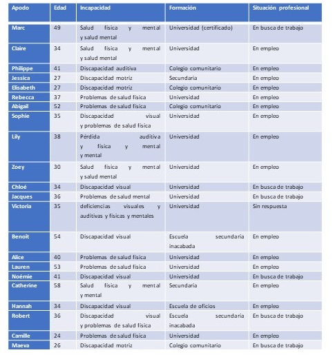 La primera fase del proceso de contratación, es decir, la selección de las candidaturas, no parece plantear ningún problema real para la mayoría de los participantes: ellos reciben invitaciones para asistir a entrevistas y/o son convocados a pruebas de contratación. Sólo una pequeña minoría afirma mencionar sistemáticamente su discapacidad en la solicitud. En otras palabras, el perfil de los participantes parece interesar a los empresarios. Esta constatación, aunque positiva, no garantiza un resultado favorable del proceso, como ilustran las palabras de una participante: “He conseguido entrevistas, pero digamos que ahí se acaba todo” (Noémie, discapacidad visual).