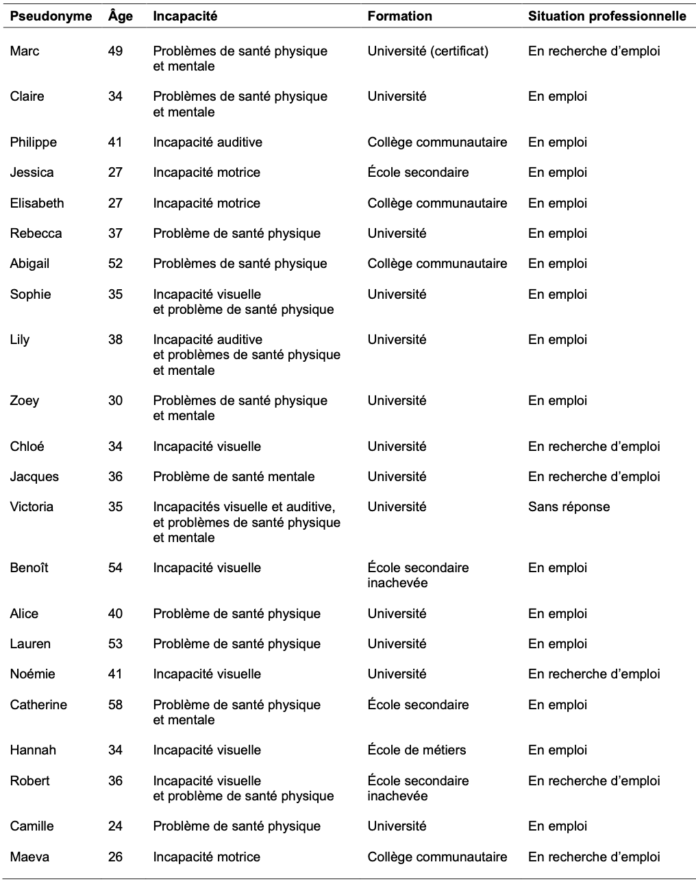 Afin de répondre aux objectifs de recherche, les participant‧es ont été sélectionné‧es selon deux critères : ceux/celles-ci devaient (1) vivre avec des problèmes de santé chroniques ou des incapacités motrices, visuelles et/ou auditives, et devaient (2) être en emploi ou en recherche d’emploi au moment de l’étude. Au total, 22 participant‧es ont été recruté‧es dans la province du Nouveau-Brunswick, soit 17 femmes et 5 hommes, âgé‧es entre 24 ans et 58 ans (M = 38, ÉT = 10). Dix-huit participant‧es ont expliqué vivre avec un seul type d’incapacité, respectivement : des problèmes de santé chroniques1 (n = 10), des incapacités visuelles (n = 4), des incapacités motrices (n = 3) ou des incapacités auditives (n = 1). Quatre participant‧es, quant à eux/elles, ont rapporté composer avec plusieurs types d’incapacités, soit des problèmes de santé chroniques combinés à des incapacités visuelles (n = 2), à des incapacités auditives (n = 1) ou aux deux (n = 1). En ce qui concerne leur niveau de formation, 18 participant‧es (82 %) possédaient un diplôme postsecondaire dont 12 (55 % de l’échantillon total) un diplôme universitaire. Deux personnes disposaient d’un diplôme d’études secondaires, tandis que deux autres n’avaient pas achevé leur formation secondaire. Finalement, 15 participant‧es (68 %) occupaient un emploi au moment de la collecte des données ; 6 (27 %) étaient en recherche d’emploi et une personne n’a pas souhaité s’exprimer à ce sujet. Il est à noter que le présent article ne vise pas à effacer la diversité qui existe parmi les personnes vivant avec des incapacités (Merzouk, 2008). Néanmoins, celui-ci se concentrera davantage sur les tendances communes qui se dégagent de leurs expériences plutôt qu’à l’hétérogénéité de leurs vécus.