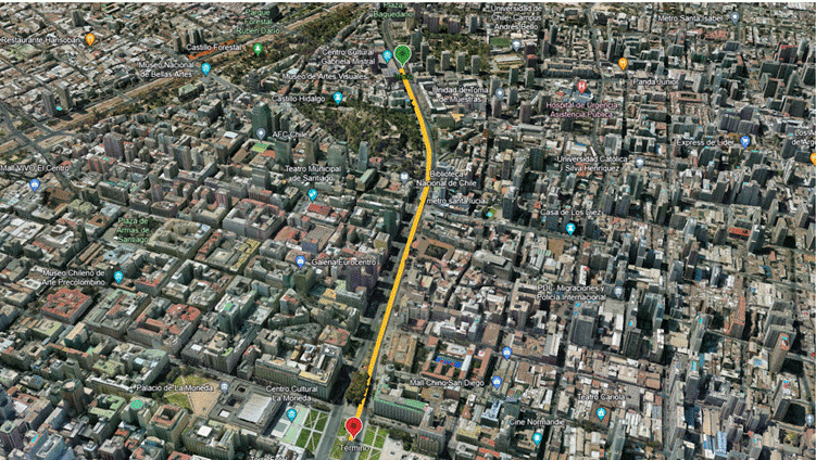 Figura 1. Mapa recorrido de la marcha (1,4 km) desde el Centro Cultural Gabriela Mistral hasta Palacio de la Moneda, por la Avenida Libertador Bernardo O’Higgins, llamada “La Alameda”.