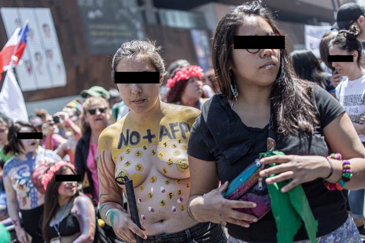 Descripción de imagen como medida de accesibilidad universal: Fotografía de participantes de la marcha, enfocado en dos mujeres. Una es una mujer ciega que usa bastón y está con su pecho pintado con consignas relacionadas con “No + AFP” (No más Administradoras de Fondos Previsionales de Chile). La compañera tiene una polera negra, un pañuelo verde como los usados por el movimiento feminista en época. Además, se pueden observar objetos de asistencia: por una parte, una mujer ciega se acompaña de un bastón blanco, además es apoyada por la presencia y percepción de movimiento de otra persona, a través de la conexión entre su mano y el codo de la otra persona, quien usa unos anteojos.