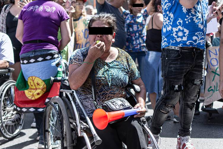 Por lo mismo, había roles asignados: movilización, quienes se encargaron de movilizar sillas de ruedas u otras personas con dificultad para desplazarse; responsables de hidratación; y responsables de mantener el orden y seguridad, por lo que portaban kits anti lacrimógenas, entre otros. La asistencia consistió en apoyar a las personas en el desplazamiento y la atención ante requerimientos de evacuación frente a posibles ataques policiales. Si bien esta marcha contaba con autorización, la organización tomó estas medidas en consideración a prácticas policiales de días previos, en los que también personas con discapacidad fueron reprimidas en su derecho a manifestarse (González, 2022). En estas prácticas hay un reconocimiento explícito de la vulnerabilidad inherente a la condición humana, que se afecta por el sol, la fatiga y también a la vulneración que se exponen los cuerpos en la manifestación, en dicho momento histórico, estableciendo estrategias para resguardo ante la represión policial.