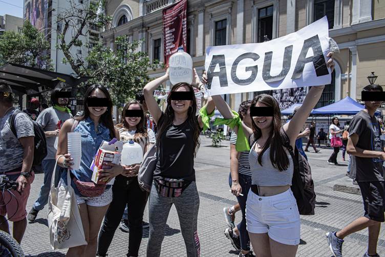 Descripción de imagen como medida de accesibilidad universal. Aparecen participantes de la marcha, en la que se enfocan en cuatro mujeres que sostienen bidones de agua, vasos y cajas de barras de cereal. Al menos dos de ellas se puede notar que portan en el brazo la pañoleta verde. Las acompaña un cartel que dice en letras grandes y en mayúsculas “agua” y uno de los bidones tiene escrito “agua por la inclusión”, como un cartel más. En el fondo se ve el frontis de la Casa Central de la Universidad de Chile.