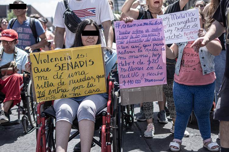 Descripción de imagen como medida de accesibilidad universal: Fotografía en la que aparecen participantes de la marcha. Se muestra principalmente a una mujer y una niña con carteles de denuncias. Una mujer en silla de ruedas aparece en primer plano, sostiene dos carteles pegados a cartón, lo que les da rigidez y soporte, y en uno de ellos se lee “violencia es que SENADIS me dé una silla de ruedas que no entra por la puerta de mi casa”. En el segundo letrero se puede leer “#renunciamañalich ‘nuestro sistema de salud es uno de los mejores y más eficientes del planeta’. Es tan así que para salvar la vida de mi mamá hoy debo más de 20 millones en la red UC y recibo $110,000 mensuales”. Al lado de esta persona, aparece una niña, quien sostiene el tercer cartel de la fotografía, el cual cubre su cara, y tiene escrito “soy Martina, no un angelito, soy sujeto de derechos. Respétame. 3/12”. Se subraya la frase “sujeto de derecho” para enfatizar la importancia de dicho reconocimiento y se destaca en rojo la palabra “no” y “respétame”.