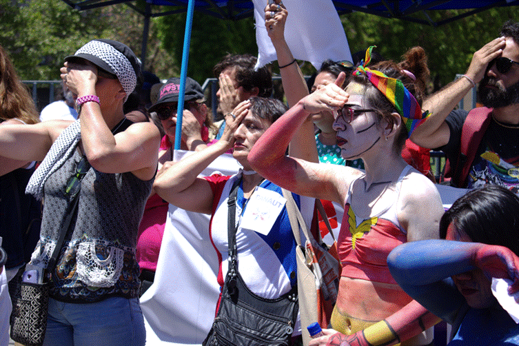 Alrededor de las 11:30 partieron bajo un intenso sol, recorriendo lentamente el trecho hasta el palacio de La Moneda al ritmo de una batucada de bailarinas y jóvenes con tambores y trompetas. Detrás había una multitud con carteles de los diferentes colectivos, algunos muy creativos y hasta humorísticos. Frente a La Moneda había habilitado un punto de prensa en el que hablaron los principales organizadores de la marcha y se hizo un espectáculo de danza (Meléndez, diciembre 2019).