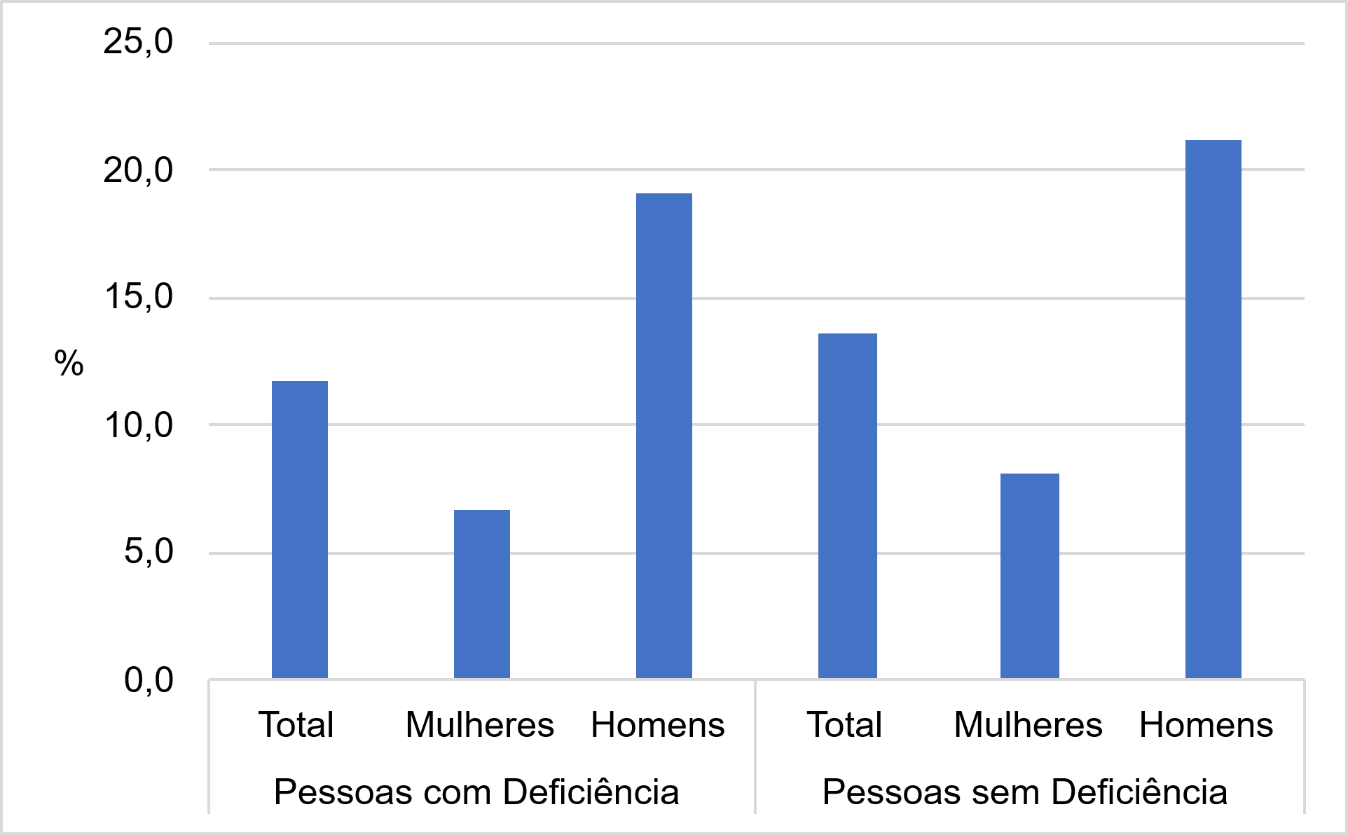 Descrição: gráfico de colunas que indicam o percentual de pessoas com Ensino Superior completo. Há seis colunas: total, mulheres e homens com deficiência; total mulheres e homens sem deficiência. Destaca-se a ampla desvantagem de pessoas com deficiência. Os percentuais constam em tabela anexa no final do artigo.